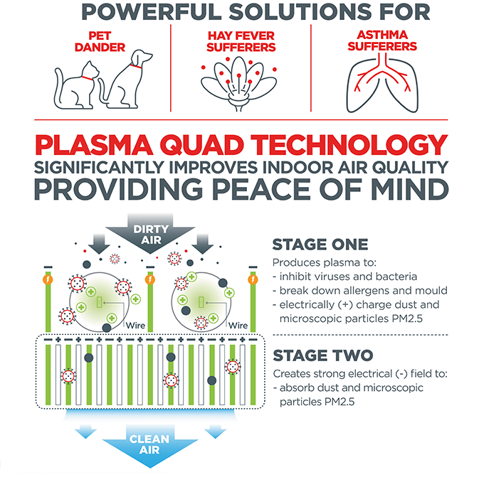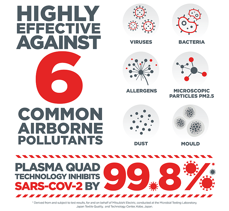 - Improved indoor air quality (IAQ) achieved by inhibiting and capturing the main airborne pathogens and pollutants such as viruses (including SARS-CoV-2), bacteria, moulds, allergens, PM 2.5 and other fine particulate (see attached brochure for processes used and the respective levels of efficacy).