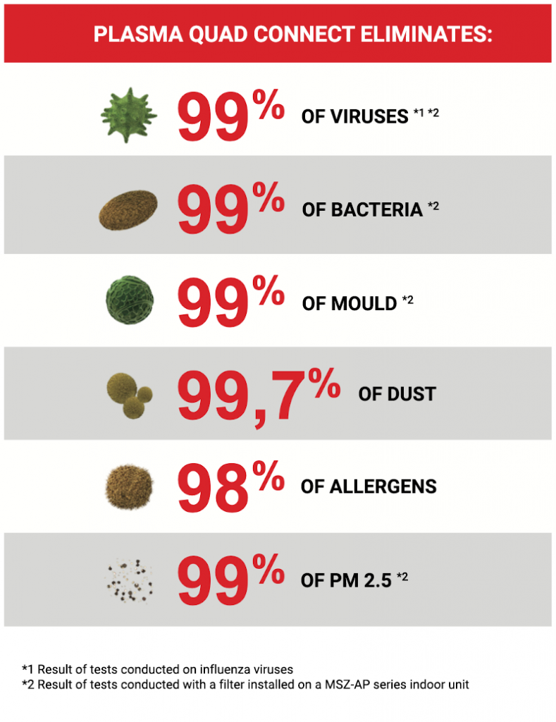 PLASMA QUAD is an active air filtration system developed by Mitsubishi Electric to abate indoor airborne pollutants.